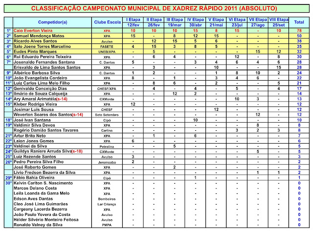 Confira a seguir, a classificação final do I Campeonato Municipal de Xadrez Rápido 2011.